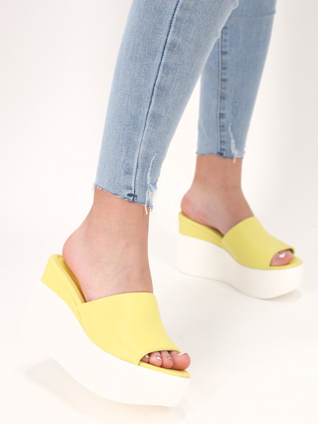 Žlté šľapky na vysokej bielej platforme. Šľapky sú z koženkového materiálu a majú mierne otvorenú špičku. Klinový podpätok je vyvýšený po celej dĺžke chodidla, vďaka čomu je nosenie týchto topánok nadmieru pohodlné. Ideálne na bežné nosenie či neformálne akcie.